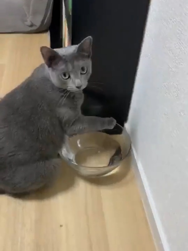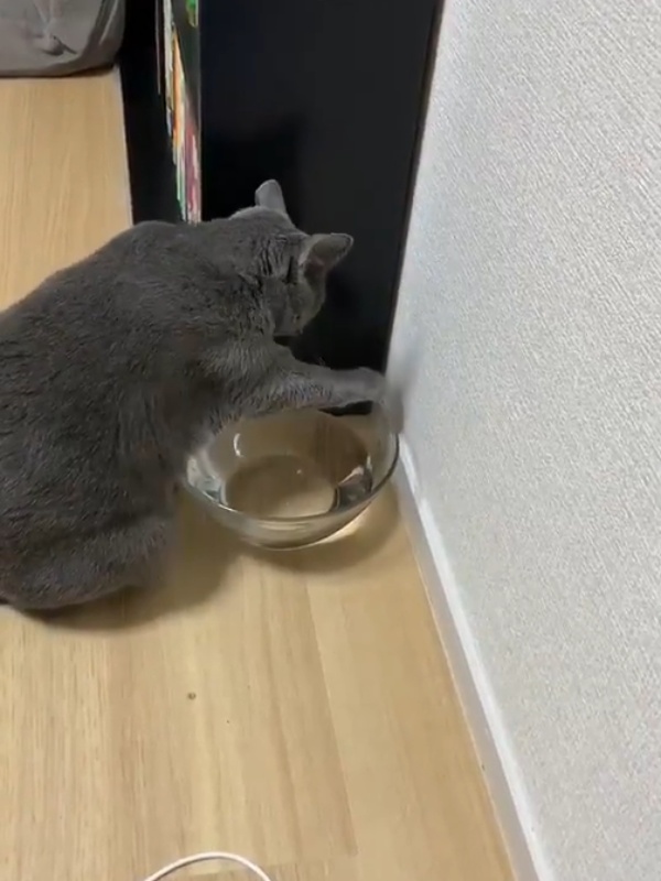 ▼推主實在不想每天清理濕濕的地板,就換上一個又大又重的玻璃碗給貓咪當水碗。沒想到貓咪看著新碗一臉困惑,還故意伸手去撥弄,想把水碗弄翻。牠見水碗沒有像往常一樣翻倒,似乎非常不解。