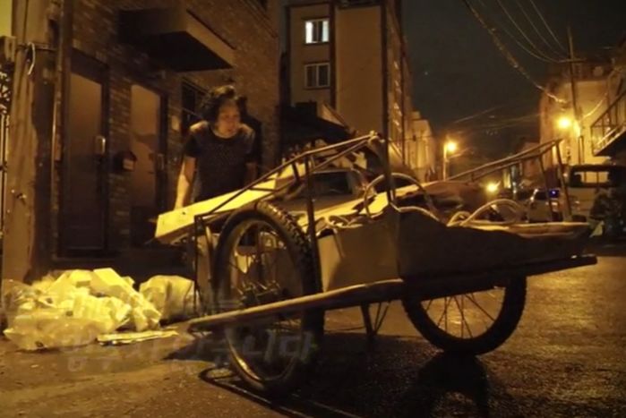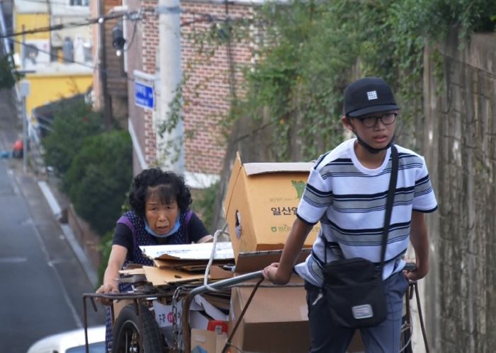 ▼奶奶得知這件事後很自責,認為是自己的職業影響了宰浩的交友。她出門撿回收時就騙宰浩說自己要去老人院參觀,讓孫子待在家裡。但宰浩知道奶奶的心意,還是堅持陪她一起去撿回收。鄰居們都認識這對祖孫,會將家裡不要的廢紙與回收物整理好放在路口。