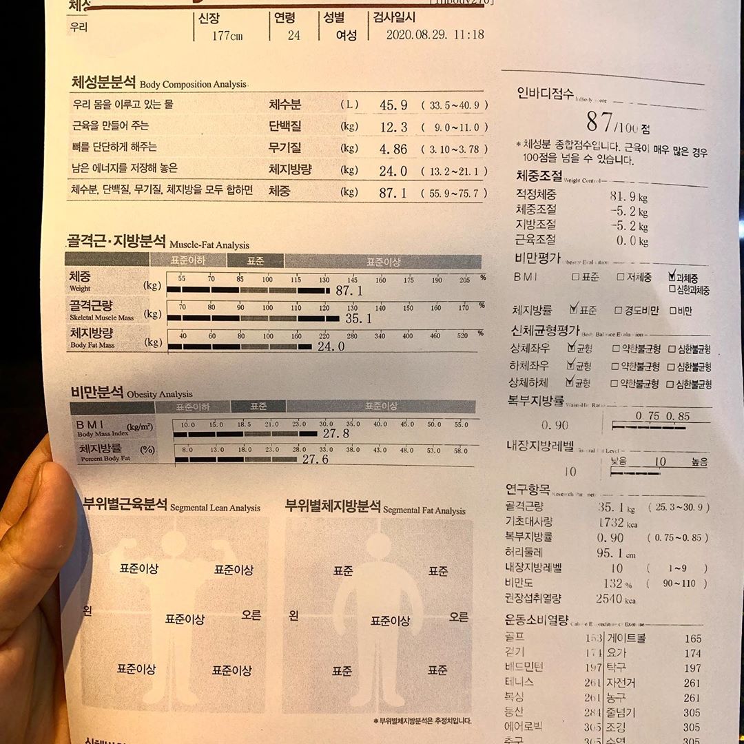 ▼她在8月29日也大方在IG上秀出自己的Inbody報告,從原本131公斤、內臟脂肪70,一路降到體重87.1公斤、脂肪24,從原本高出健康標準許多的狀態,數字漸漸趨向正常。