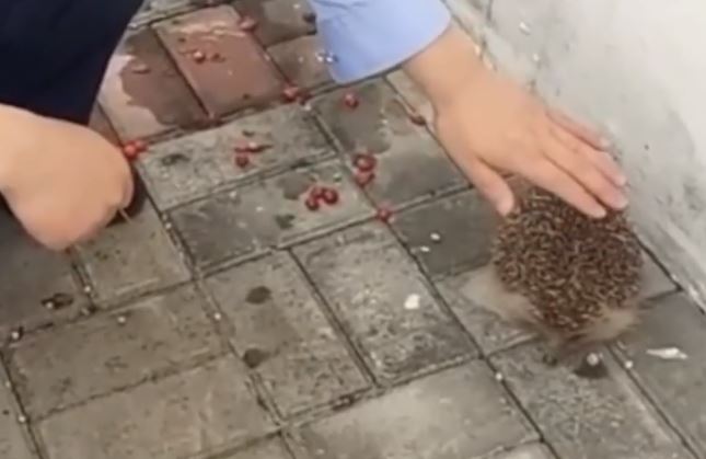 ▼小刺蝟偷吃櫻桃,民警給牠打包帶走: