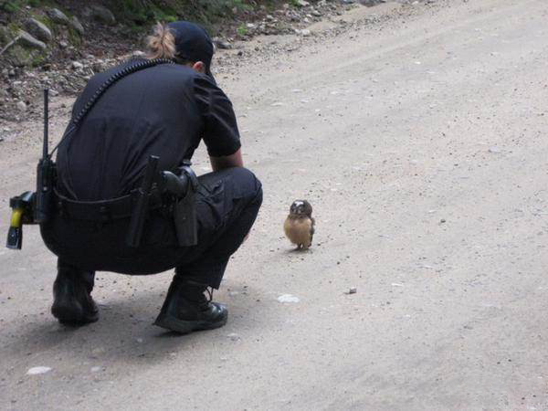 這次邂逅發生在博爾德縣尼德蘭鎮西北幾英里處的彩虹湖營地附近,不過為了保護貓頭鷹的棲息地,這名女警並沒有透露確切的座標位置。這隻可愛的貓頭鷹當時應該是正在恍神的時候突然被叫醒,然後就傻傻地愣在當地了吧!不管怎麼樣,希望最後牠有順利地找到回家的路啊!