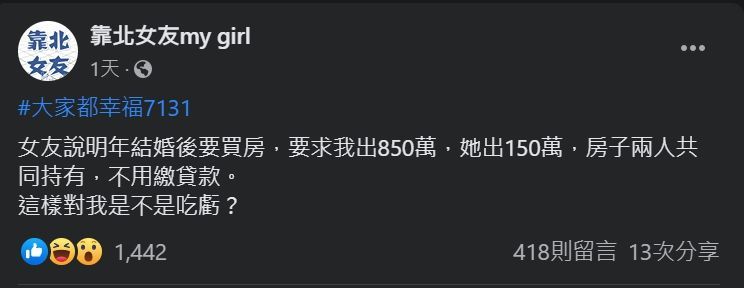 ▼原po表示,他和女友準備明年結婚,女友希望結婚後要買房,而且要求原PO出850萬,自己則出150萬。房子兩人共同持有,不用繳貸款。原po忍不住問:「這樣對我是不是吃虧?」