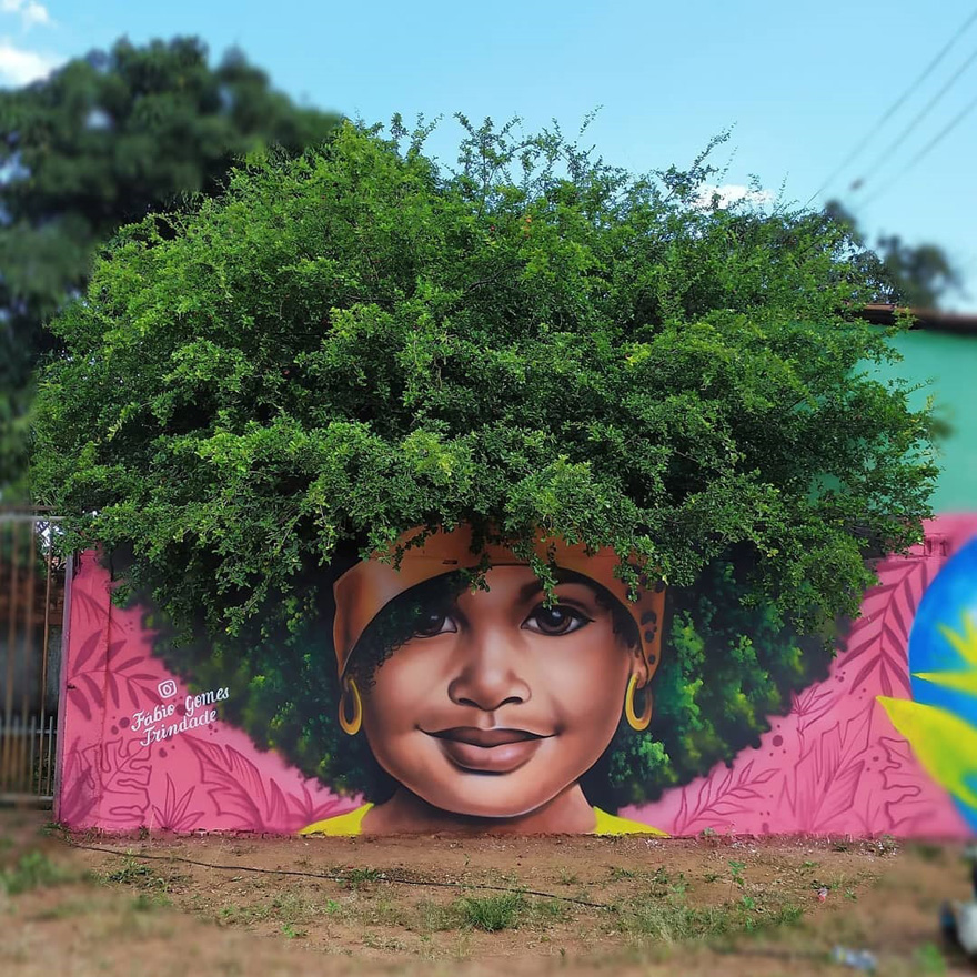 ▼Fábio Gomes Trindade非常有創意,他用滿滿的熱情,在牆壁上畫出一張張美麗的臉。結合周圍的花草樹木,就有了有趣的髮型。這樣的作品能給人帶來數不盡的驚喜。