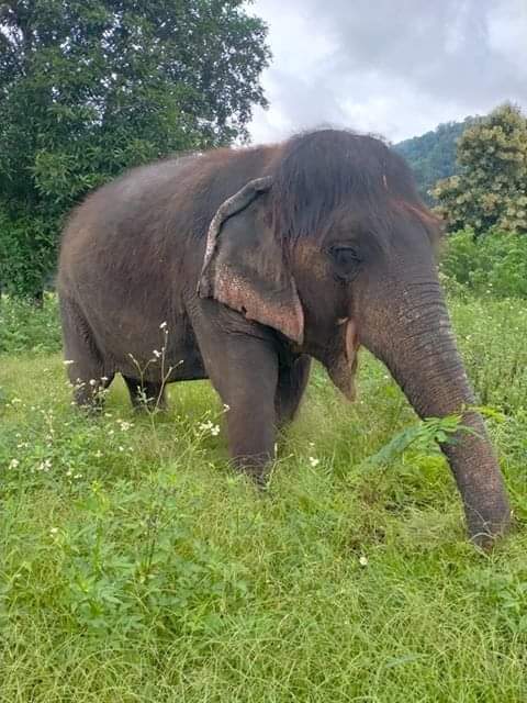 ▼邦媽頭上的毛髮垂下來蓋在臉上,就像瀏海一樣,顯得非常年輕。其實牠已經70多歲,是一隻大象奶奶啦。牠從湄登的大象園區退休,目前正在養老院過著悠閒的生活,每天散散步、曬曬太陽、享受美食,非常愜意。