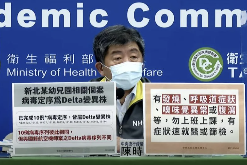 2021年09月09日新北幼兒園群聚案例擴大,昨天(8日)再新增7人確診,其中已有10人基因定序出爐,確定為Delta變異株。指揮中心指揮官陳時中表示:「若民眾近期有出現一點點類似感冒症狀,不要覺得好像沒什麼,一定要請假在家不要去上班上課。」