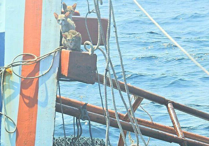 ▼今年3月,一艘拖網漁船在孟加拉灣的安達曼海(Andaman Sea)海域附近發生事故,船上的8名船員被另一艘路過的漁船救起。泰國皇家海軍奉命前往支援,當他們到達現場時,船隻已經沈沒大半。他們正準備進一步調查船隻是否有漏油的情形,沒想到竟發現4隻小貓蜷縮在船艙中。