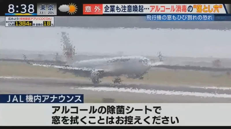 ▼就連日本航空都在機艙內廣播:「請不要拿酒精棉片擦拭飛機窗戶,很可能破壞窗戶的強度造成高空中龜裂。」其實航空公司在每一段航程前都會徹底清潔、消毒機艙,乘客不需要自己再用酒精棉片去擦拭。