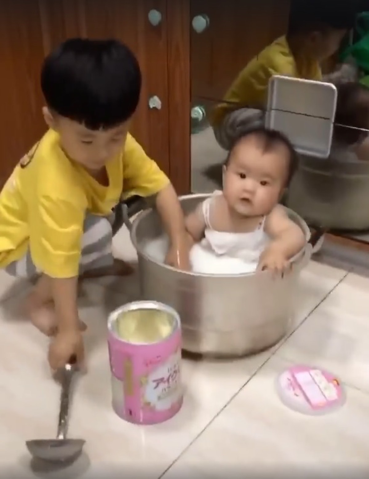 ▼有網友在臉書社團裡分享一則短片,並以小孩子的逗趣口吻說媽媽已經三天沒有懲罰他了,表示影片中的小男孩行徑簡直是「皮在癢」了。影片中一位小女嬰坐在大湯鍋子裡,看著身旁的哥哥正在很「勤勞」的將一整罐的奶粉倒進湯鍋中,並且一次倒沒完,還繼續倒第二次,灑了滿地的奶粉,接著又繼續拿起大湯勺,準備要讓妹妹洗一洗正統「牛奶浴」。