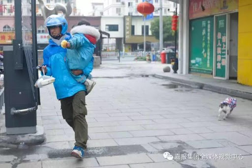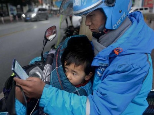 ▼李幫勇在送餐給客人的時候,若是在他的視線範圍內,他就會讓女兒坐在安全座椅上;步行送餐時,他就會一手抱女兒、一手取餐點,有次因為等不到電梯,他還抱著女兒爬上17層樓梯,因為他表示:「不能因為我帶著孩子,就讓點外賣的人多等。」