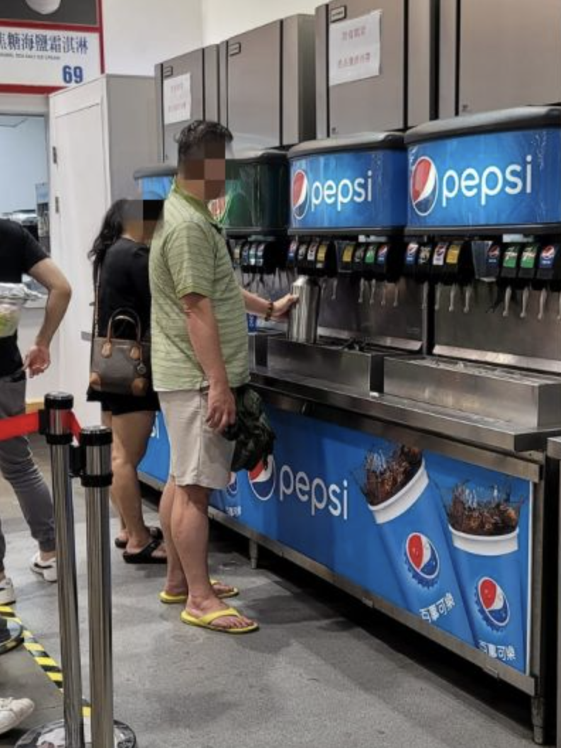 在好市多的熟食區購買熱食,有些會附飲料。店員會提供盛飲料的專屬杯子,內用無限續杯。如果單買飲料,要先到櫃檯付錢,店員一樣會給杯子,然後才能去飲料機裝飲料,按規定是不能用其他杯子的。這名男子不僅貪小便宜,這種做法也不衛生啊~