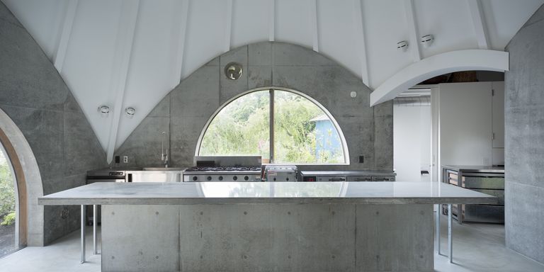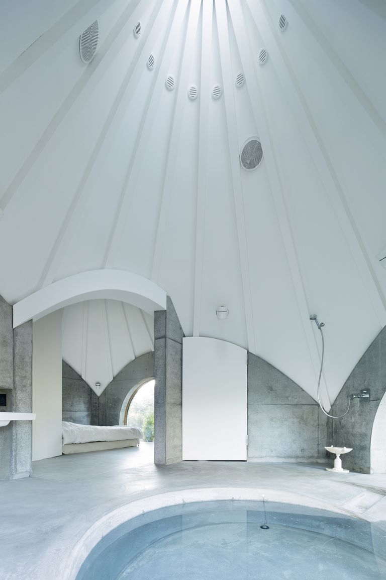 ▼小屋外形是帳篷的模樣,但內部結構以方形為主,四方出入口是圓拱造型。簡約的白色天花板搭配水泥色牆面和地板,整體的風格非常純淨。