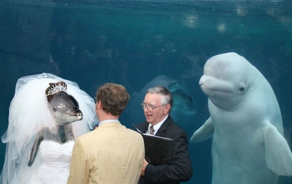 ▼當時這對新人正在宣誓,一隻白鯨突然出現在他們身後,面帶微笑見證了這浪漫的一刻。這有趣的一幕被拍下來後引發不少網友PS修圖。比如這張圖中,白鯨就成為了新人的伴郎,牠在想:「我應該早告訴她我愛她。現在她跟我最好的朋友結婚了。我該怎麼把戒指遞過去呢?」