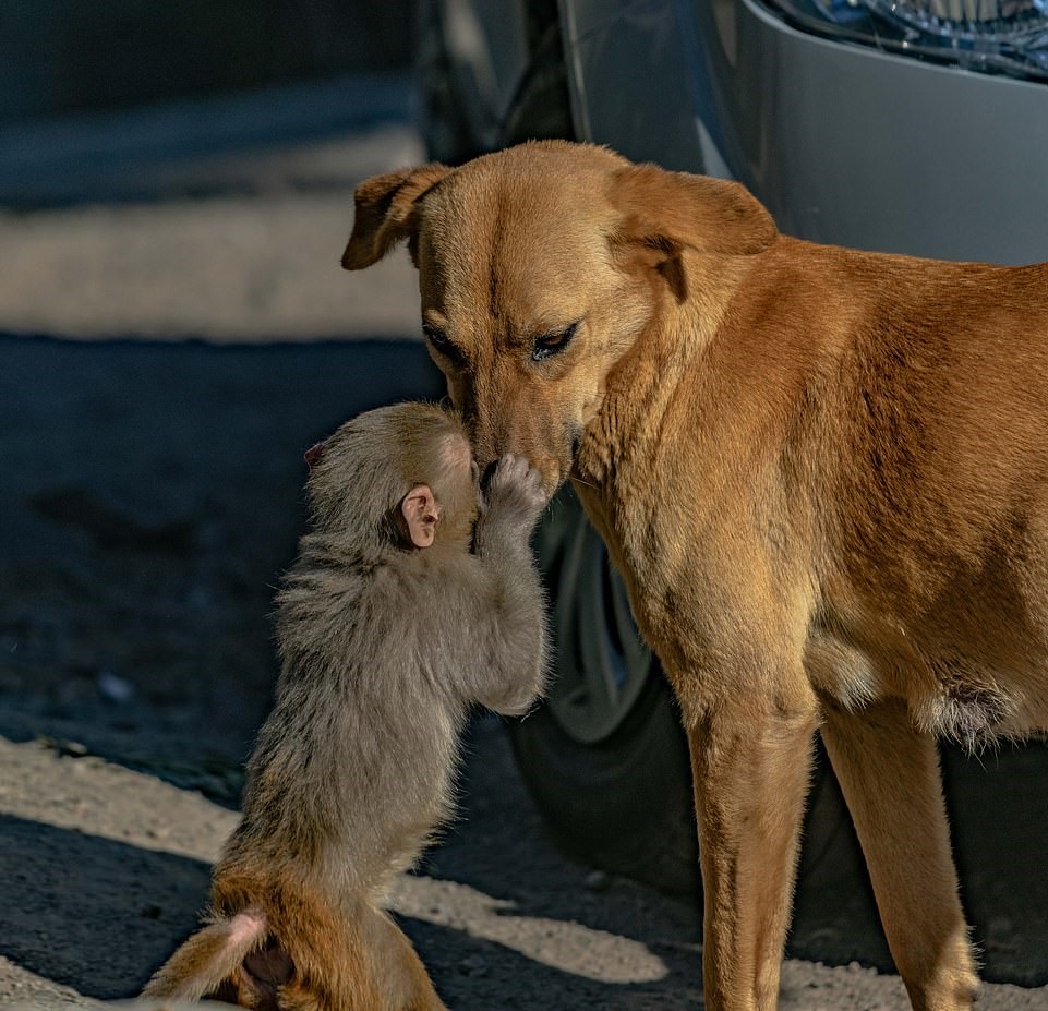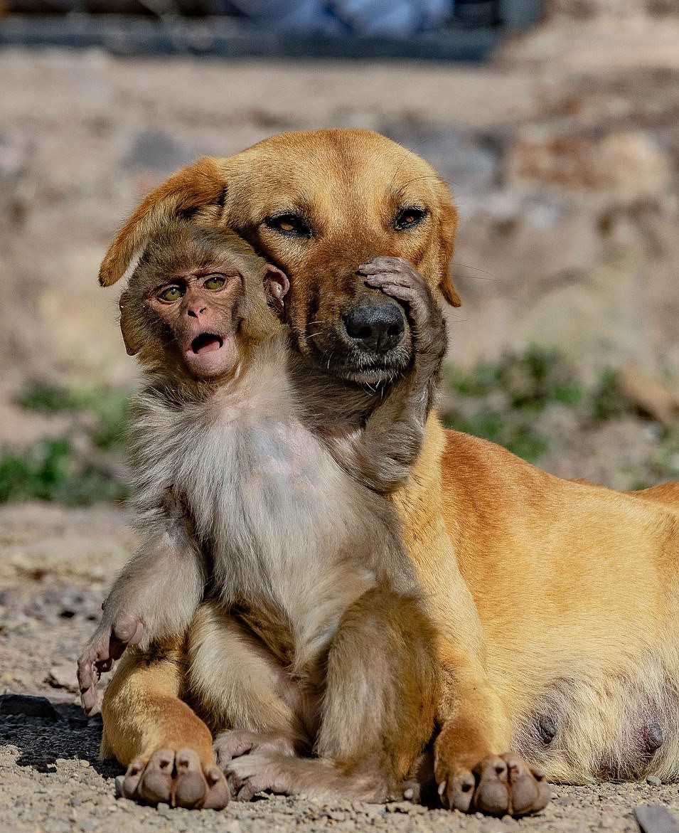 2021年09月17日母愛太偉大,甚至能跨越物種!攝影師Prakash Badal在印度拍攝鳥類時,偶然看到了一隻狗狗和一隻小猴親密相處。原來那隻懷孕的狗媽收養了失去父母的小猴,把牠當成自己的孩子照顧。這對特別的母子相處的畫面非常溫馨。