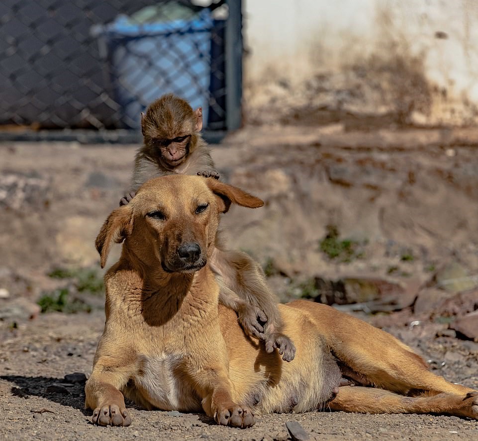 ▼狗狗和猴子的生活習慣不同,所以狗媽媽和小猴偶爾也會產生磨擦,但狗媽媽很有愛心,牠不忍看到小猴沒有家長照顧,還是將牠留了下來。Prakash Badal說:「這隻狗狗有大愛,牠給那些自私自利的人們好好上了一課。」