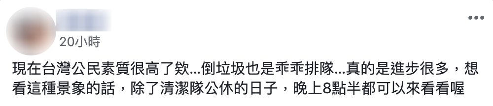 ▼每當熟悉的音樂聲響起,就會見到一整排站在門外等著倒垃圾的民眾,有時候垃圾車遠了點,還有人會使出「投擲」的技術,就是想要將垃圾丟進垃圾車中。但是網友貼出的照片中,地點為台中的五權三街,裡面等著倒垃圾的民眾卻是整齊站成一排,拿著家庭的垃圾,守秩序的等著丟,讓原PO大讚:「現在台灣公民質素很高了欸,倒垃圾也是乖乖排隊,真的是進步很多」。