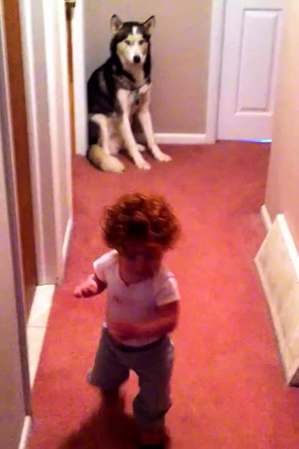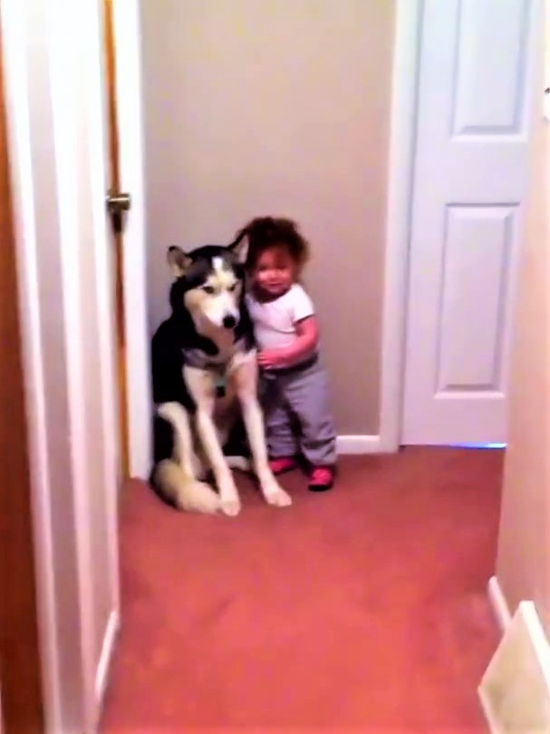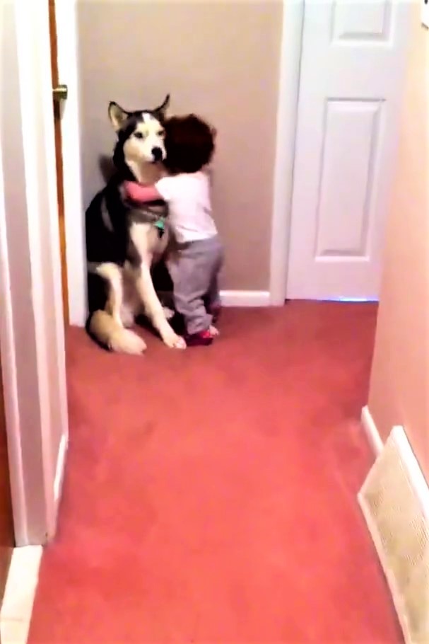 吸塵器噪音嚇到小女娃! 她直奔「找哈士奇求安慰」汪護身前:偶保護妳~