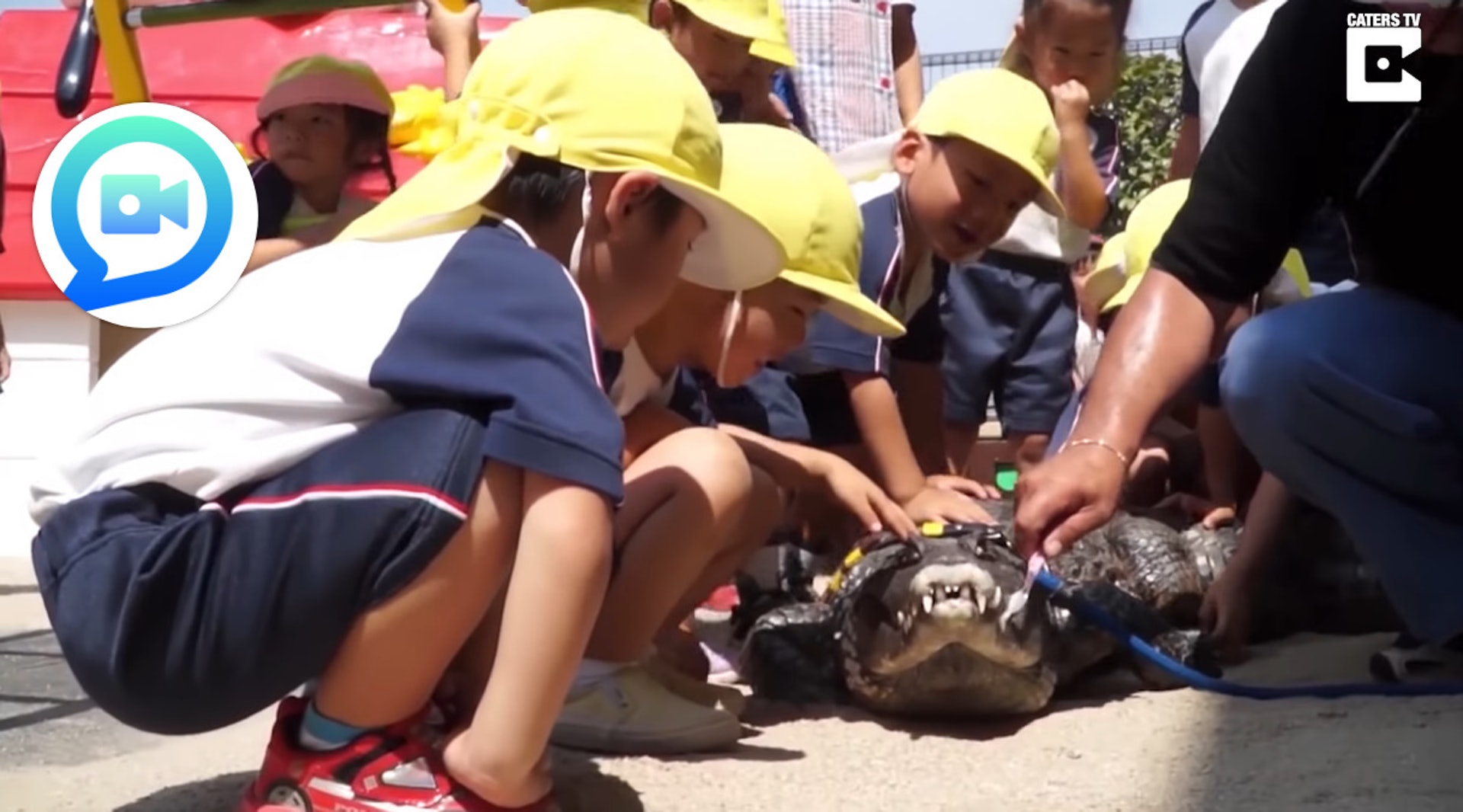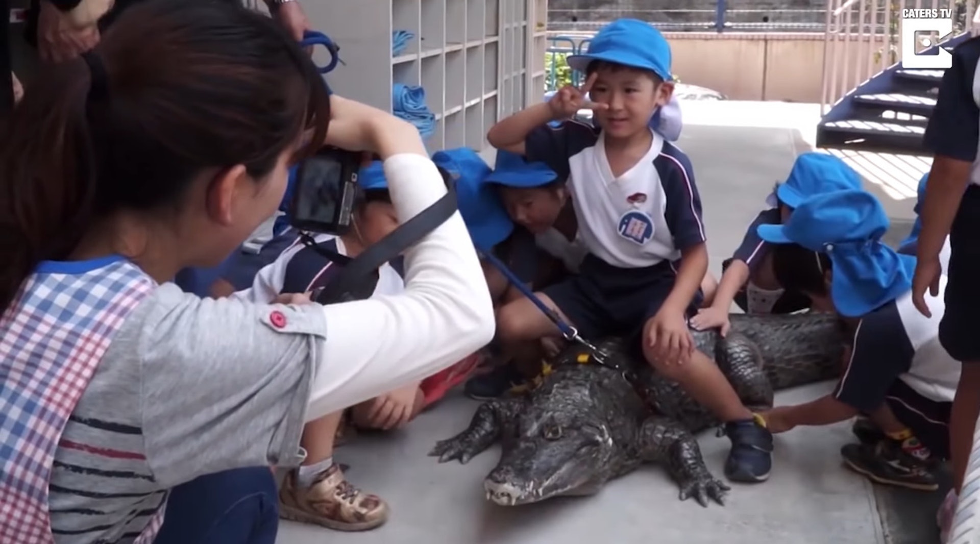 ▼有時候遛鱷魚經過幼稚園附近,小朋友們也會跟鱷魚親密接觸一下。