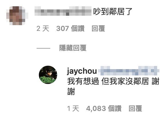 2021年09月23日周杰倫在IG上分享自己在家深夜彈琴的過程片段,本來想和粉絲互動猜猜看自己演奏的是哪一首曲子,誰知有網友表示這樣會「吵到鄰居了」,竟引來周董回覆:「我有想過,但我家沒鄰居,謝謝。」