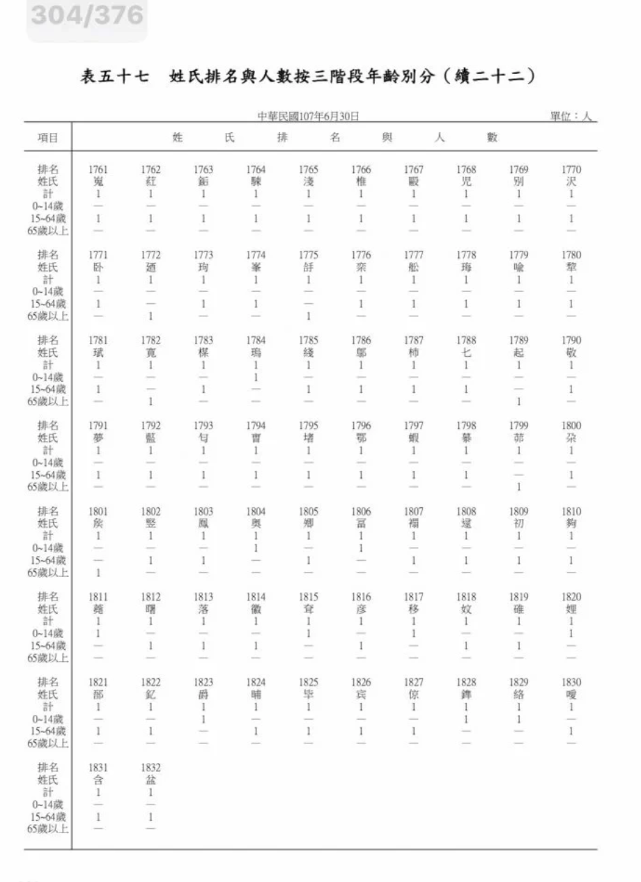 ▼原po表示,最近在翻閱政府的統計資料時,無意間發現了內政部在民國107年編撰的《全國姓名統計分析》。因為原po自己的姓氏不算常見,所以他查閱了一下資料,發現自己的姓氏竟然在前100名內,這讓他覺得很驚訝。