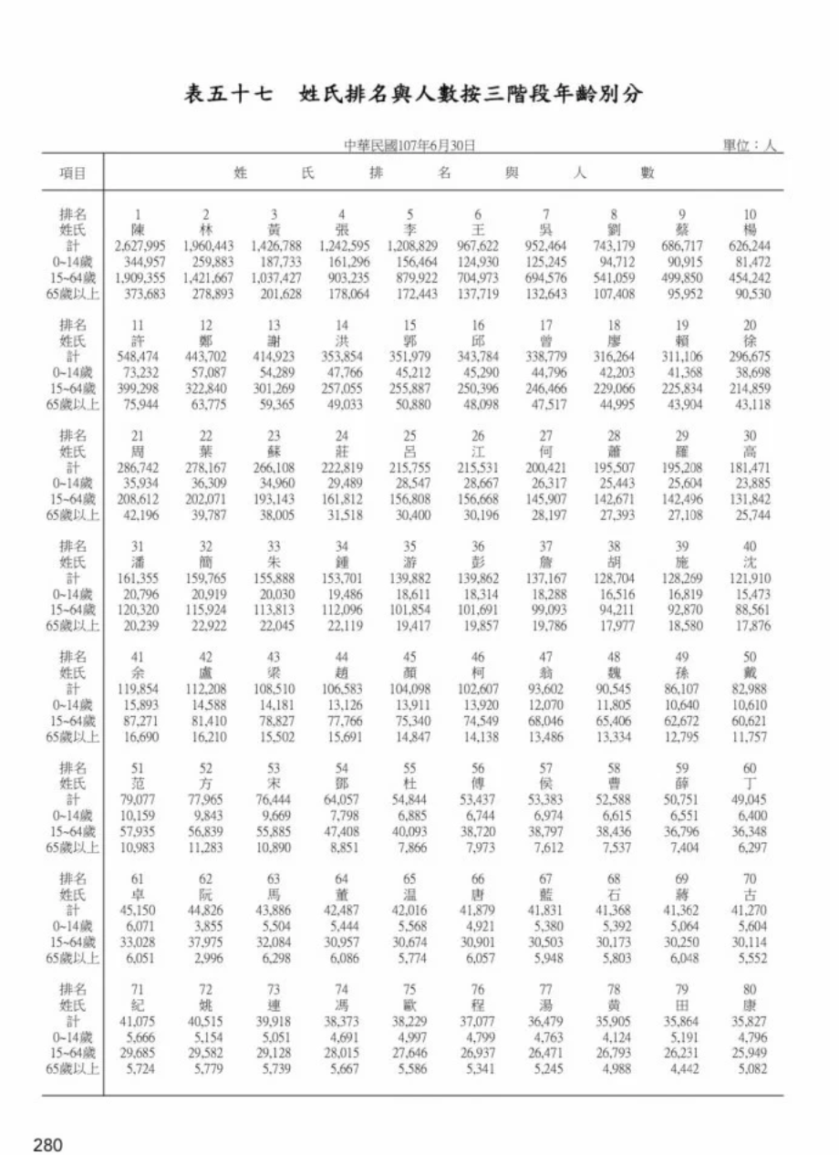 姓「陳」的有262萬人!全台姓氏排行出爐 你的姓排第幾?