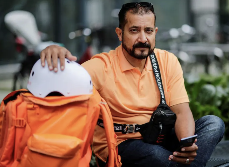 ▼現在Sayed每天都會穿上招牌的橘色背心,背著方形大背包,騎著自行車外送餐點。他說:「這份工作沒什麼好羞恥的。工作就是工作。有工作就代表大眾有需求……總是有人要來做。」