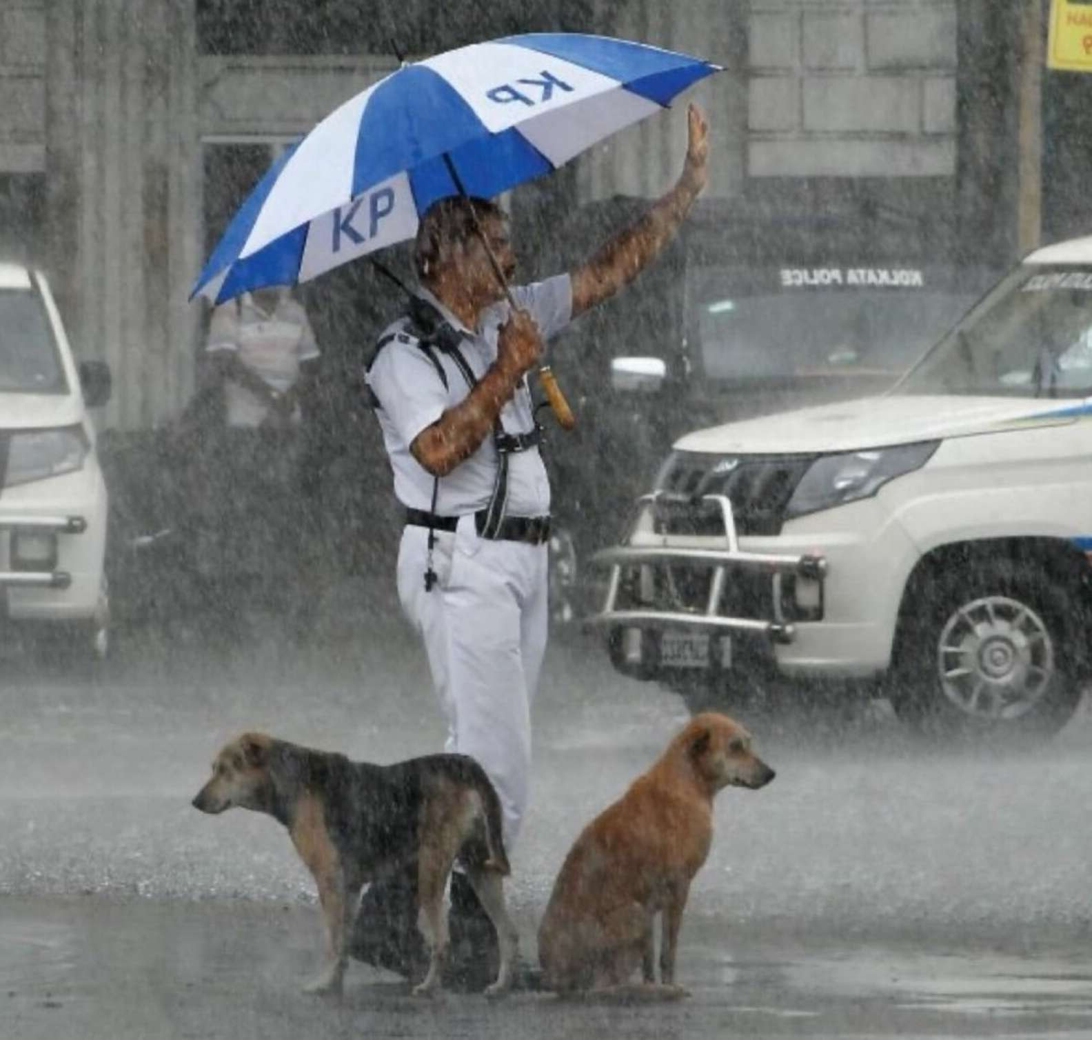 加爾各答警方在臉書上分享了這張照片,只見當時下著滂沱大雨,2隻流浪狗在馬路上徘徊,不知道該何去何從。交警Tarun Kumar Mandal一邊指揮交通,一邊幫牠們撐傘。2隻狗狗躲在Tarun的雨傘下,那一幕看起來非常暖心。