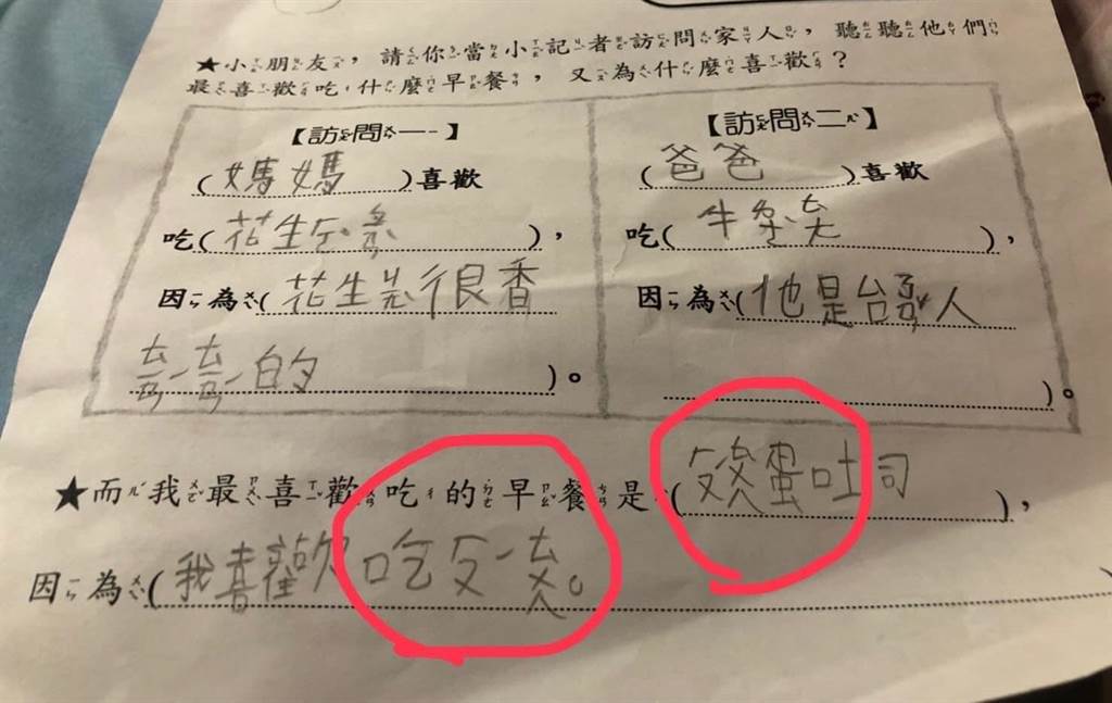 小朋友訪問完父母後依序寫下:「媽媽喜歡吃花生『ㄏㄛˋㄆㄧㄢˋ』,因為花生醬很香」、「爸爸喜歡吃牛『ㄌㄜˋㄊㄤ』,因為他是『台ㄋㄢˇ人』」。至於他自己喜歡吃的早餐,則是:「自己最喜歡吃的早餐是『ㄏㄡˊㄊㄨㄟ』蛋吐司,因為我喜歡吃『ㄏㄡˊㄊㄨㄟ』。」