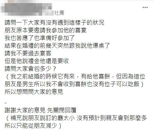 ▼原PO在臉書社團發文詢問,她原本已答應一位朋友要出席喜宴,但是那位朋友卻在婚禮的前幾天才表示婚宴現場桌數不夠了,所以請她不要出席宴客,「但是他說禮金他還是要收」,原PO補充該位男友人之前曾出席過自己的婚禮,也有收過喜餅,所以想詢問網友,這種情況應該包多少。