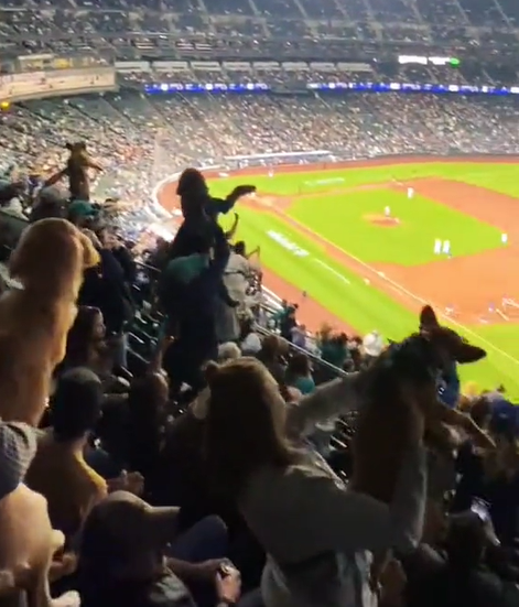 (Seattle, Washington): Fans bring their dogs to "Bark at the Park" night at the Seattle Mariners game. Stadium has the "Simba Cam" where people hold up their dogs 'Lion King style' for a chance to be featured on the jumbotron. 🦁🎶🐶🎵🦁 (🎥:af0ne) pic.twitter.com/hhS3a5cv64