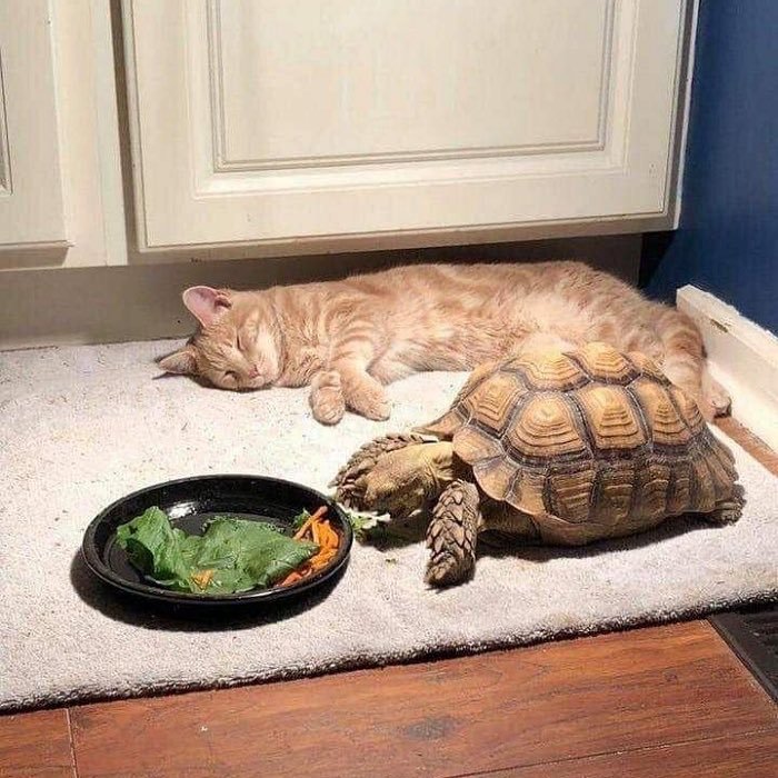 不同物種的動物也能成為好朋友,牠們相處的畫面太可愛,看起來超療癒。不知道烏龜什麼時候才能吃完,貓咪都等到睡著了~