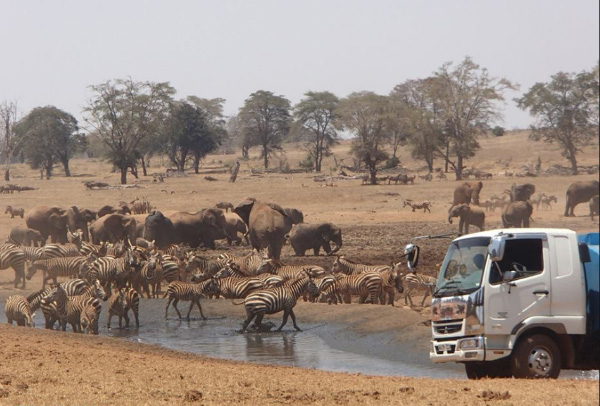 ▼Patrick是當地村莊的碗豆農夫,從小跟野生動物一起長大。有一次他偶然看到一頭水牛正不斷嗅已經乾涸的水池,這讓他意識到,動物們急需飲用水。因此他租了一輛能夠容納1萬公升的水車,每天開車到70公里外的地方蓄水,再載到國家公園中灑水。