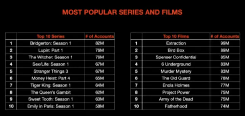 ▼Netflix從來都不會公開即時的完整收視率,這次Sarandos也沒有透露詳細的數據。根據Netflix以往提供的官方數據來看,前幾名的熱門劇集有《柏捷頓家族:名門韻事》、《獵魔士》、《亞森·羅蘋》、《紙房子4》、《怪奇物語3》等等。其中最受歡迎的《柏捷頓家族:名門韻事》,開播28天創下8200萬戶家庭觀看的紀錄。