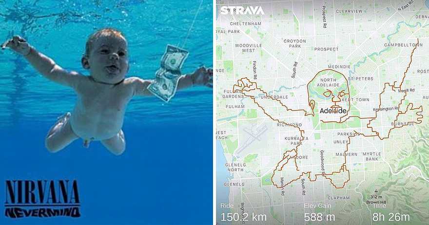 ▼為了紀念《Nevermind》發行30週年,Stokes騎上自行車,透過追蹤自行車行駛軌道的GPS軟體「Strava」,穿梭在阿得雷德市(Adelaide)的街頭,花8小時的時間畫出嬰兒游泳圖案。