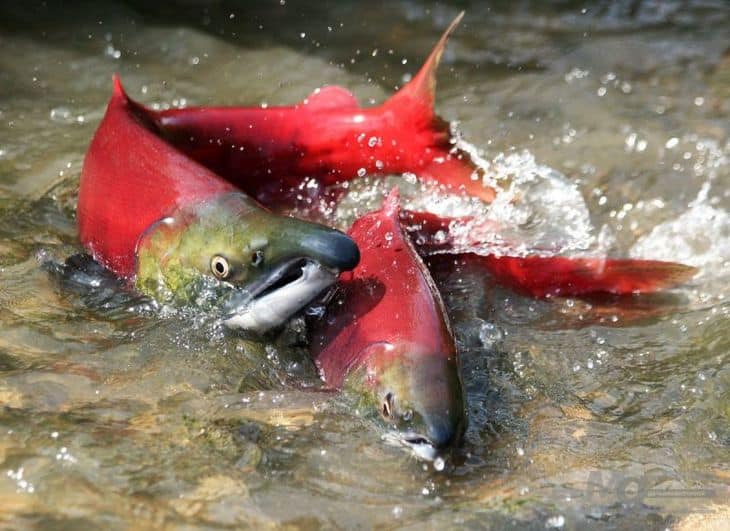 ▼這種配色奇怪的魚類就是鮭魚。鮭魚出生在淡水中,但會游到大海中生長。每年的產卵季,牠們的身體都會變成紅色,並順應太陽和地球磁場的引導,成群結隊洄游到淡水出生地繁殖。