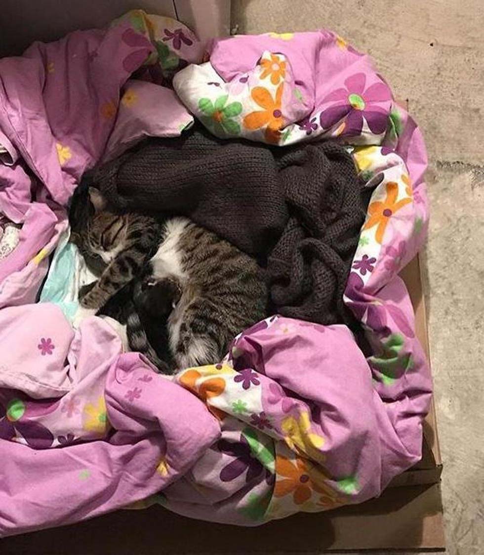 ▼不過Zümrüt過慣了流浪的生活,很難適應住在屋裡。Ahsen就先把牠安置在車庫中,專門為牠和貓寶寶們設置了一個溫暖的角落。Zümrüt對這一安排非常滿意,牠躺在柔軟的小窩中,表現得非常開心。