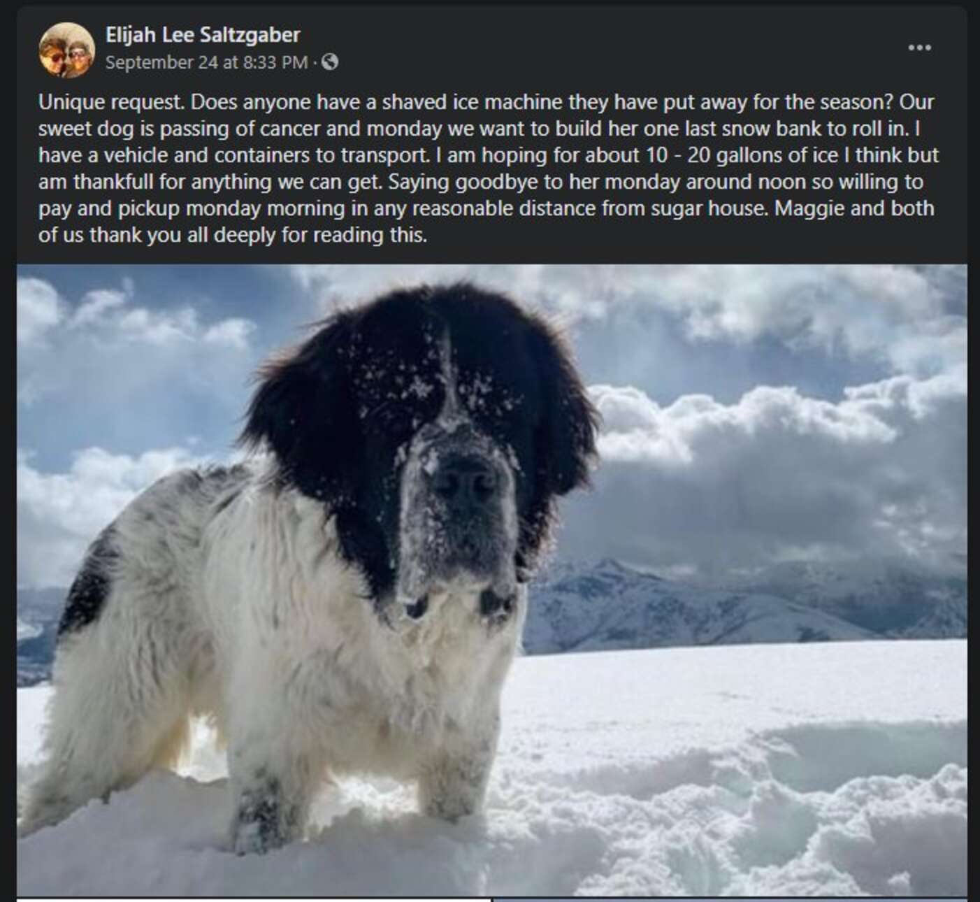 ▼Maggie患病後對氣溫更加敏感,待在炎熱的地方很不舒服,但牠的身體狀況欠佳,無法出遠門。主人決定在社交平台上發文,徵求造雪機,可以購買10到20加侖冰塊,讓Maggie能再次接觸到雪地。