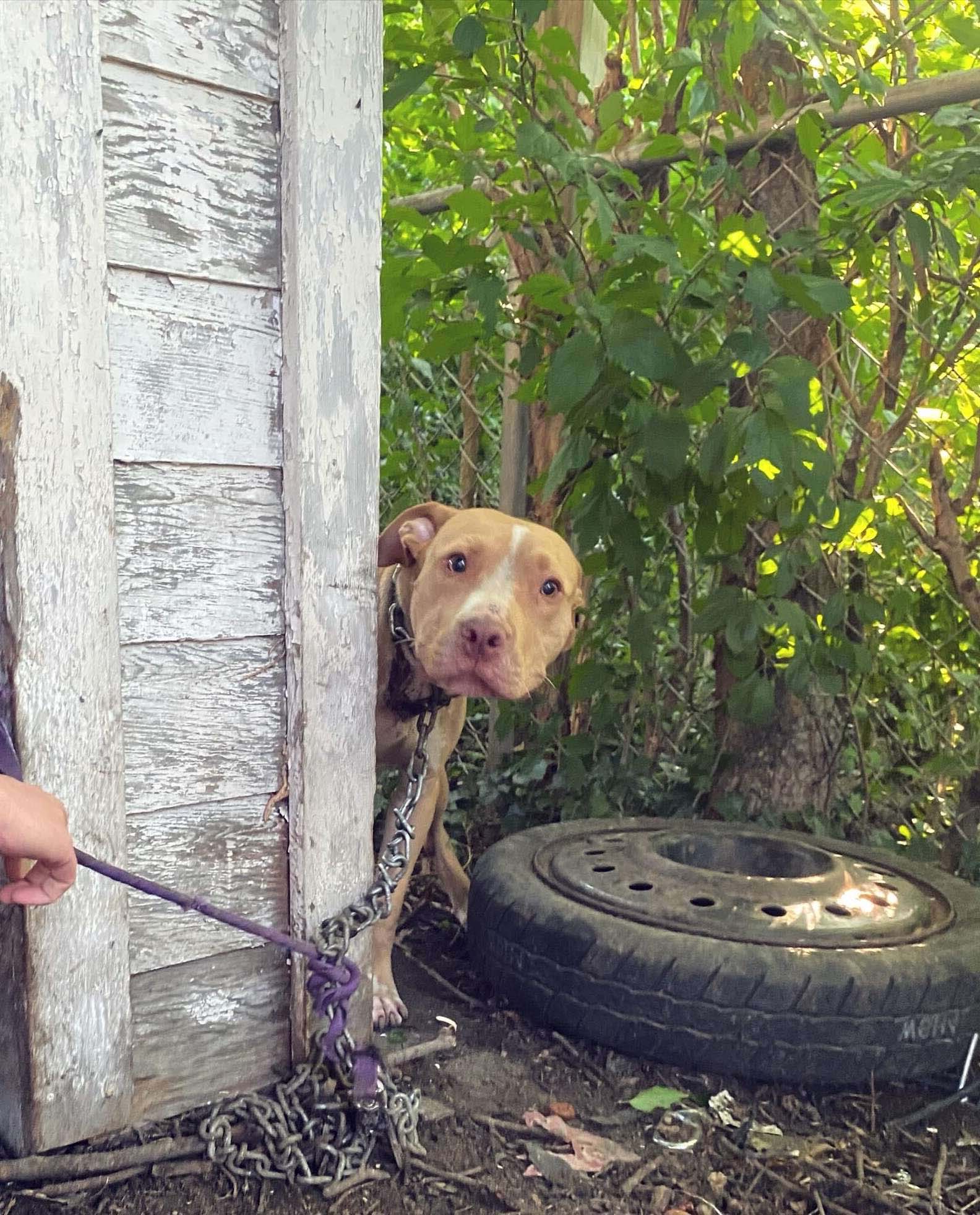 2021年10月11日日前密西根州底特律(Detroit)的一位居民發現住家附近的院子裡有一隻被遺下的狗狗。牠的脖子上綁有鐵鍊,看起來非常可憐。這位好心的居民立刻聯絡動物救援機構,「Rebel Dogs Detroit」的志工Tiffany Perkins很快趕到現場。第一次見到這隻叫Beaker的狗狗,她的心就融化了~