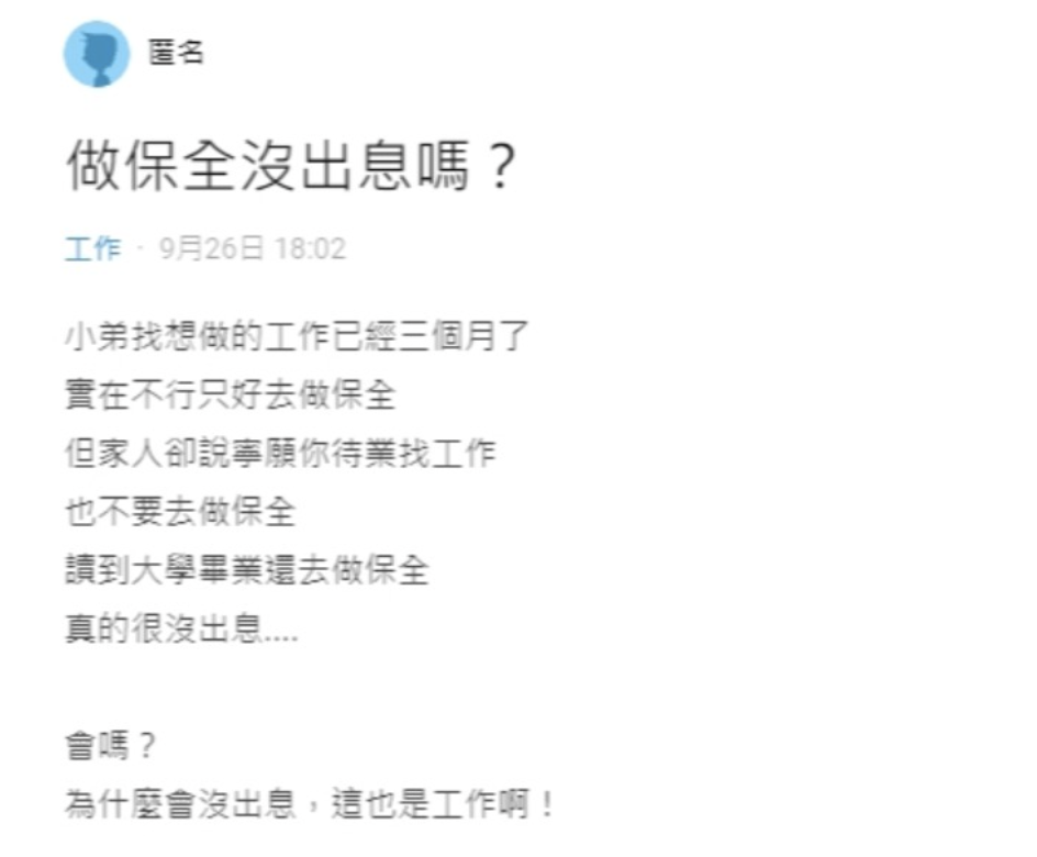 2021年10月07日大學畢業去當保全,竟被罵沒出息?!日前一位網友在Dcard發文表示,自己待業3個月,想在過渡期先從事保全工作維持收入,沒想到家人都不支持,還認為當保全很沒出息。他不理解家人的想法,不禁詢問網友:「做保全很沒出息嗎?」