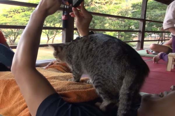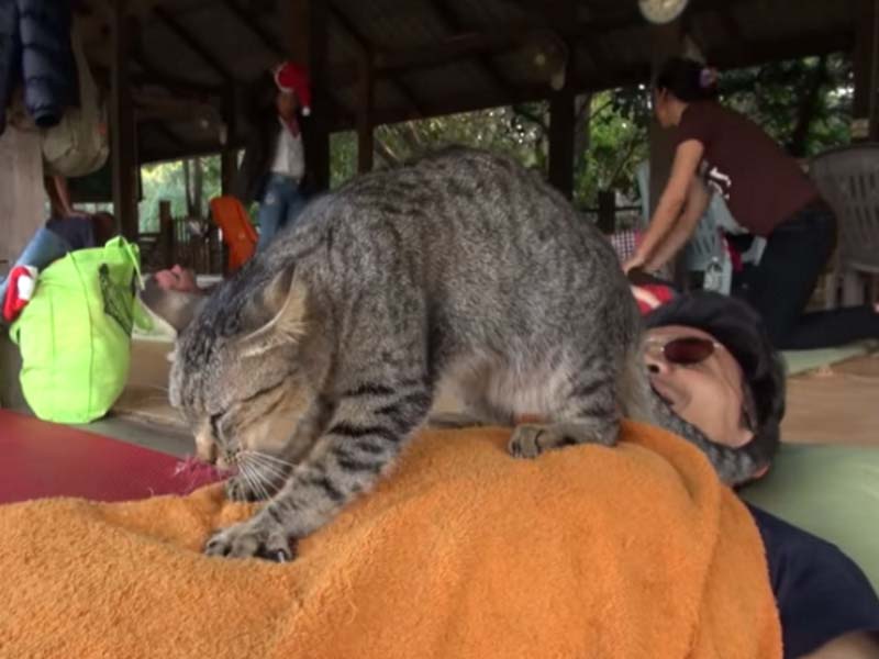 ▼泰國清邁的一處「大象自然公園」裡,生活著很多從各地救援來的受虐、或需要特別照顧的大象,還有很多流浪貓狗。遊客中心的二樓設有按摩服務,前來旅行的觀光客們可以在這裡體驗傳統泰式按摩。這裡有一位非常特別的按摩師傅,那就是一隻萌萌的虎斑貓。