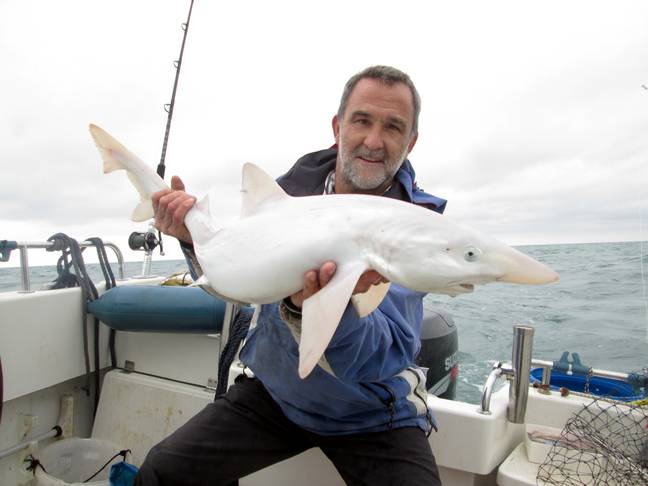 ▼Jason拿著鯊魚拍了幾張照片,很快就將牠放歸大海,鯊魚離水不到1分鐘。他說:「我從沒聽過其他人捕獲白化鯊魚。1年前似乎有一位威爾斯漁民捕到過白化鯊魚,但那一尾魚非常小,只有2.7公斤左右。」
