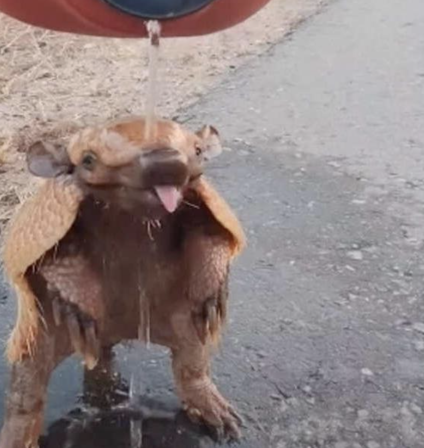 ▼Nelson猜測,天氣那麼炎熱,這隻犰狳可能是口渴了。於是他從車上拿來水瓶,一點一點餵犰狳喝水。小犰狳看起來真的很渴,竟忍不住站起來喝水。Nelson給牠餵水後,還將水澆在牠的身上,希望幫牠解暑降溫。