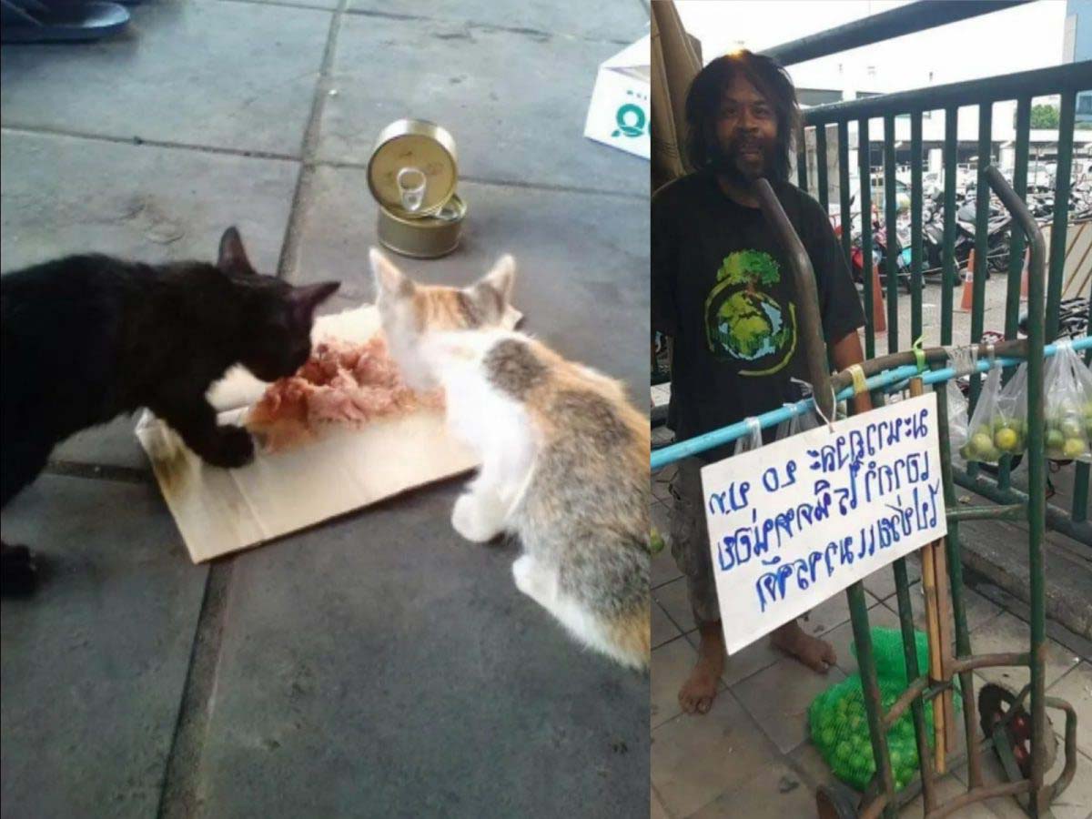 2021年10月10日泰國有一位街友Dum,他每天都會去街上賣萊姆。不過他賺到錢後並不是買大餐自己享用,而是買貓食給流浪貓吃。原來他自從在街上見到一隻浪貓後,就開始照顧牠們。對他來說,這些浪貓不是寵物,更不是陌生的動物,而是珍貴的家人~