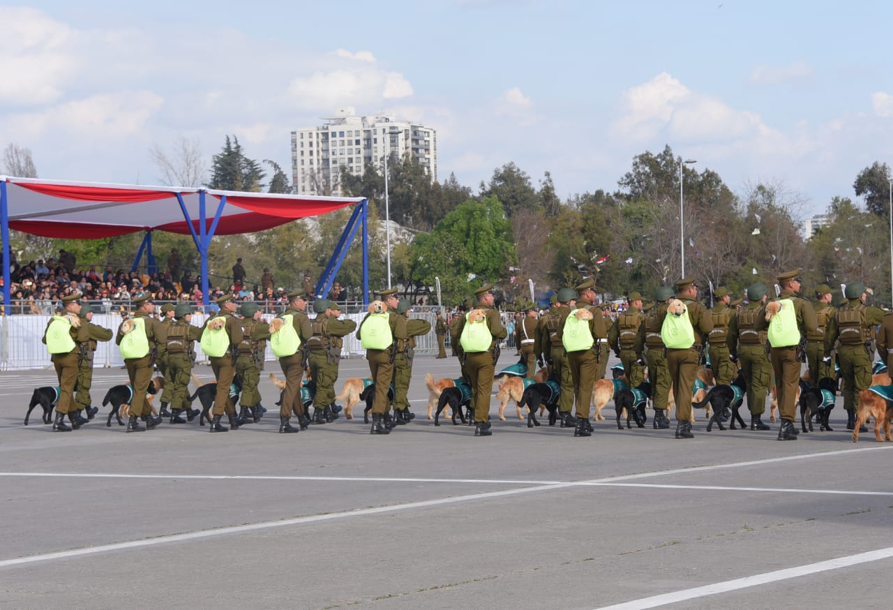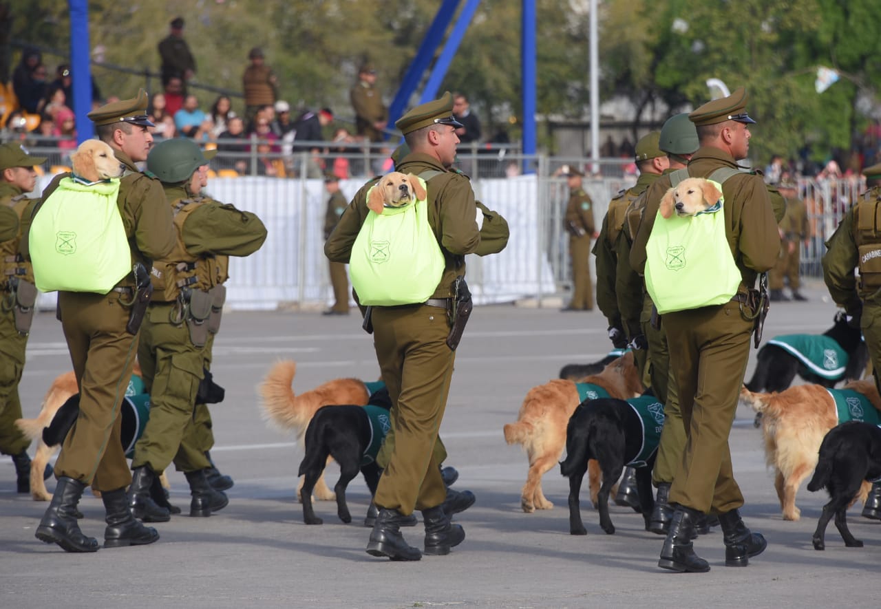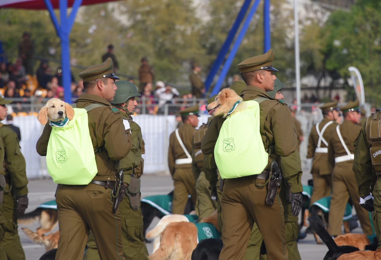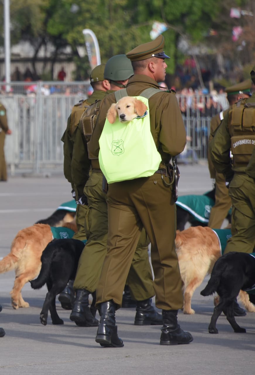 2021年10月09日閱兵典禮上警犬非常引人注目!9月18日是智利的國慶日,每年的閱兵典禮上,卡賓槍騎兵隊(Carabineros de Chile)都會帶領警犬入場。警犬們穿著統一的制服,看起來超帥氣。還有見習中的菜鳥幼幼,乖巧待在警察的後背包裡,簡直萌化人心。