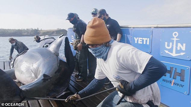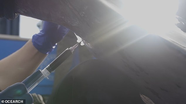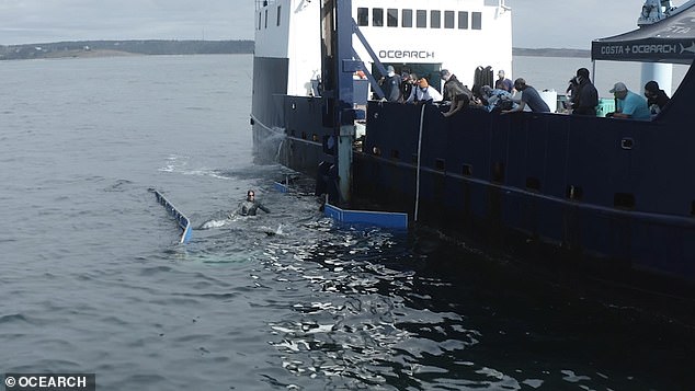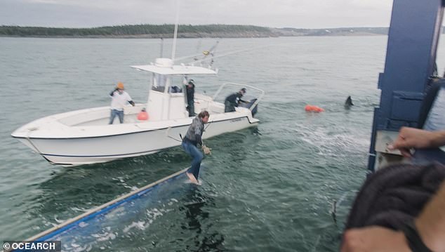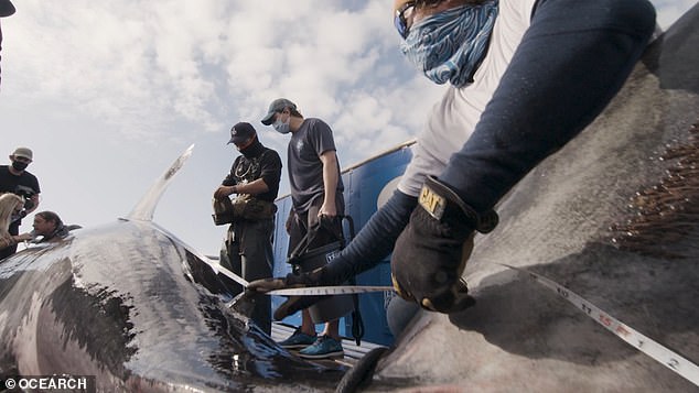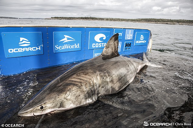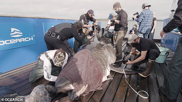 ▼研究團隊捕獲這隻大白鯊後,用機械控制的方式來移動牠,確保牠的安全。研究人員從牠身上採集了足夠的數據,比如牙齒上的細菌樣本、糞便樣本等等,用來研究鯊魚的飲食;血液、肌肉、皮膚等樣本則用來做醫學研究。