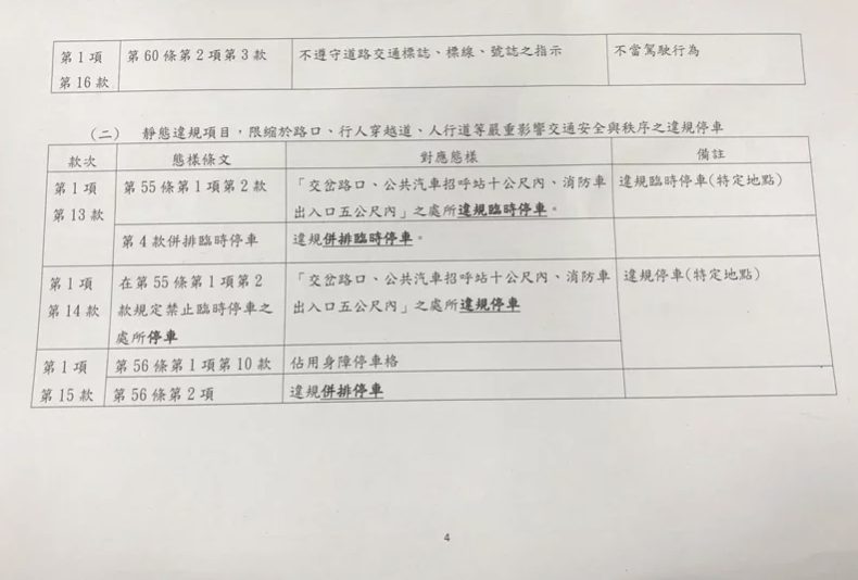 ▼「靜態項目」縮限於路口、行人穿越道、人行道等嚴重影響交通安全與秩序等違規停車。包括交岔路口、公共汽車招呼站十公尺內、消防車出入口五公尺內違規臨時停車,違規併排臨時停車,以及佔用身障停車格等。另外,紅黃線違停只要沒嚴重影響交通安全秩序,就不能逕行檢舉。