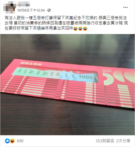 ▼原po表示,去年時他沒有領振興三倍券,2009年發放消費券時他正在念書,直接被母親強行收走拿去買冰箱。今年拿到五倍券後,他不打算花掉,而是決定保留下來做紀念,過幾年再拿出來回味。