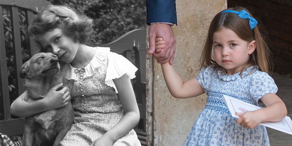 ▼1936年抱著愛犬的伊莉莎白二世 vs 2018年的夏綠蒂公主。