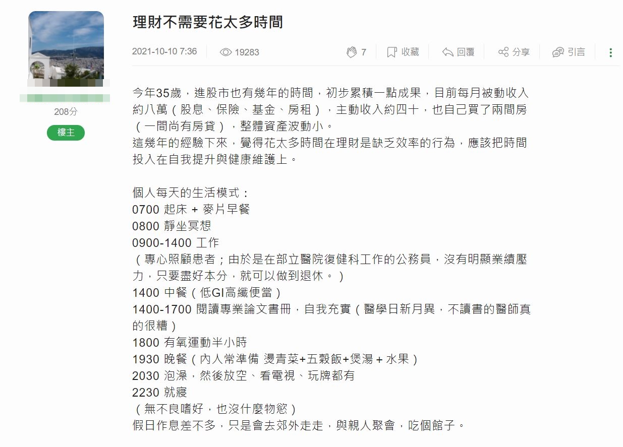 原po表示,他是一名部立醫院復健科的醫師,上班時間為早上9時至下午2時,沒有明顯的業績壓力,只要盡好本分就可以做到退休。目前他已經買了2間房子,買第一間房子時有父母幫忙,第二間是靠自己購入的,現在還在繳貸款,因為他想將錢刻意留做投資資金。