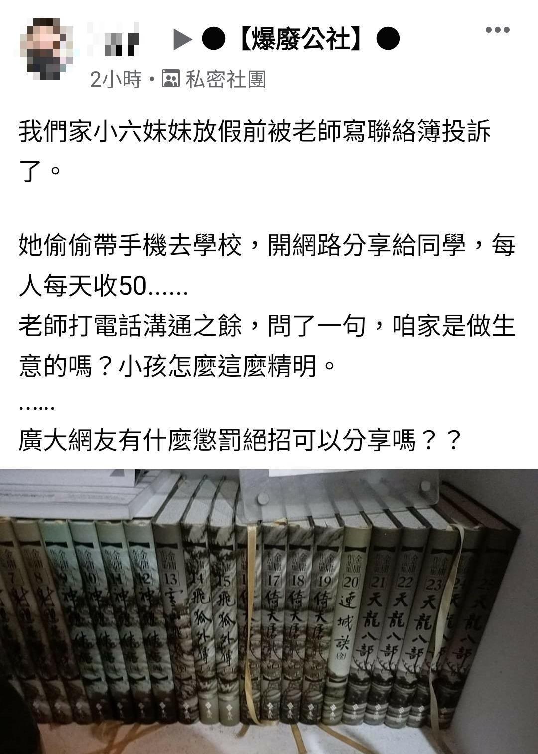▼原po表示,女兒正在讀國小6年級,放假前老師寫聯絡簿投訴,原來女兒偷帶手機到學校,還開網路分享給同學,每人每天收費50元。後來老師曾撥電話到家裡溝通,問:「你們家是做生意的嗎?小孩怎麼這麼精明?」這讓原po無奈不已,將這件事po上網,詢問網友們有沒有什麼招數來懲治女兒。