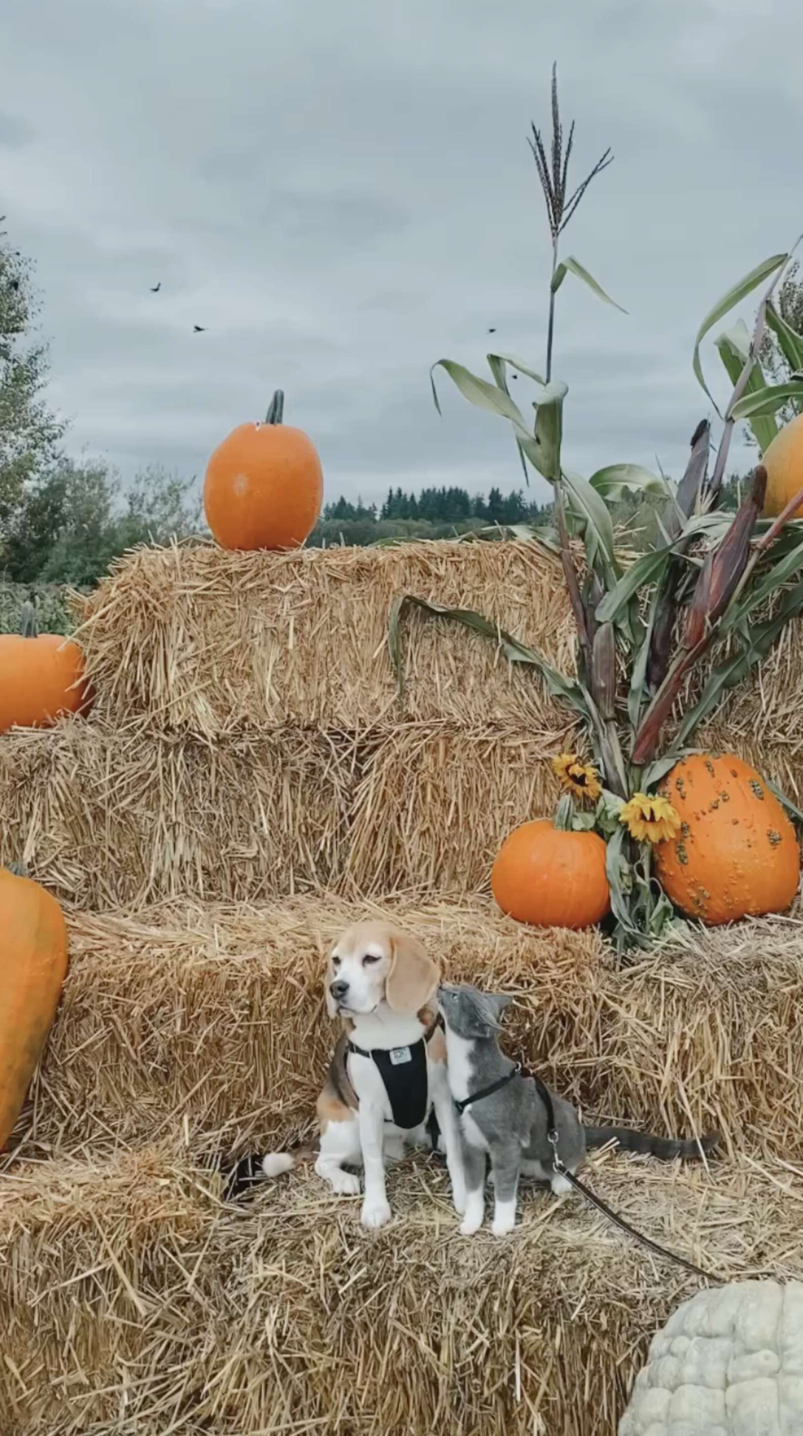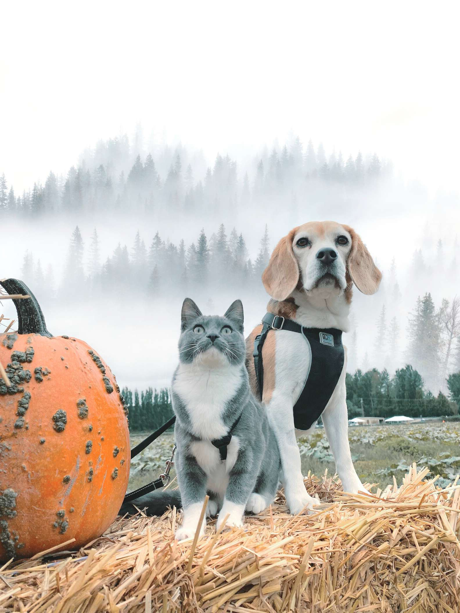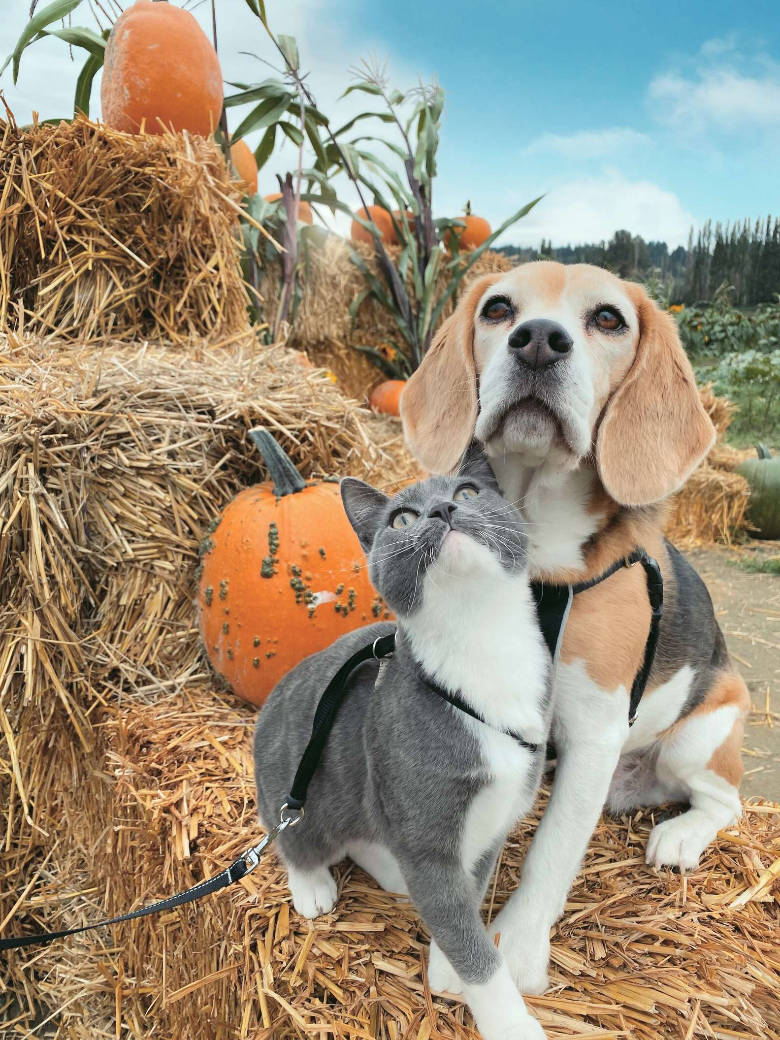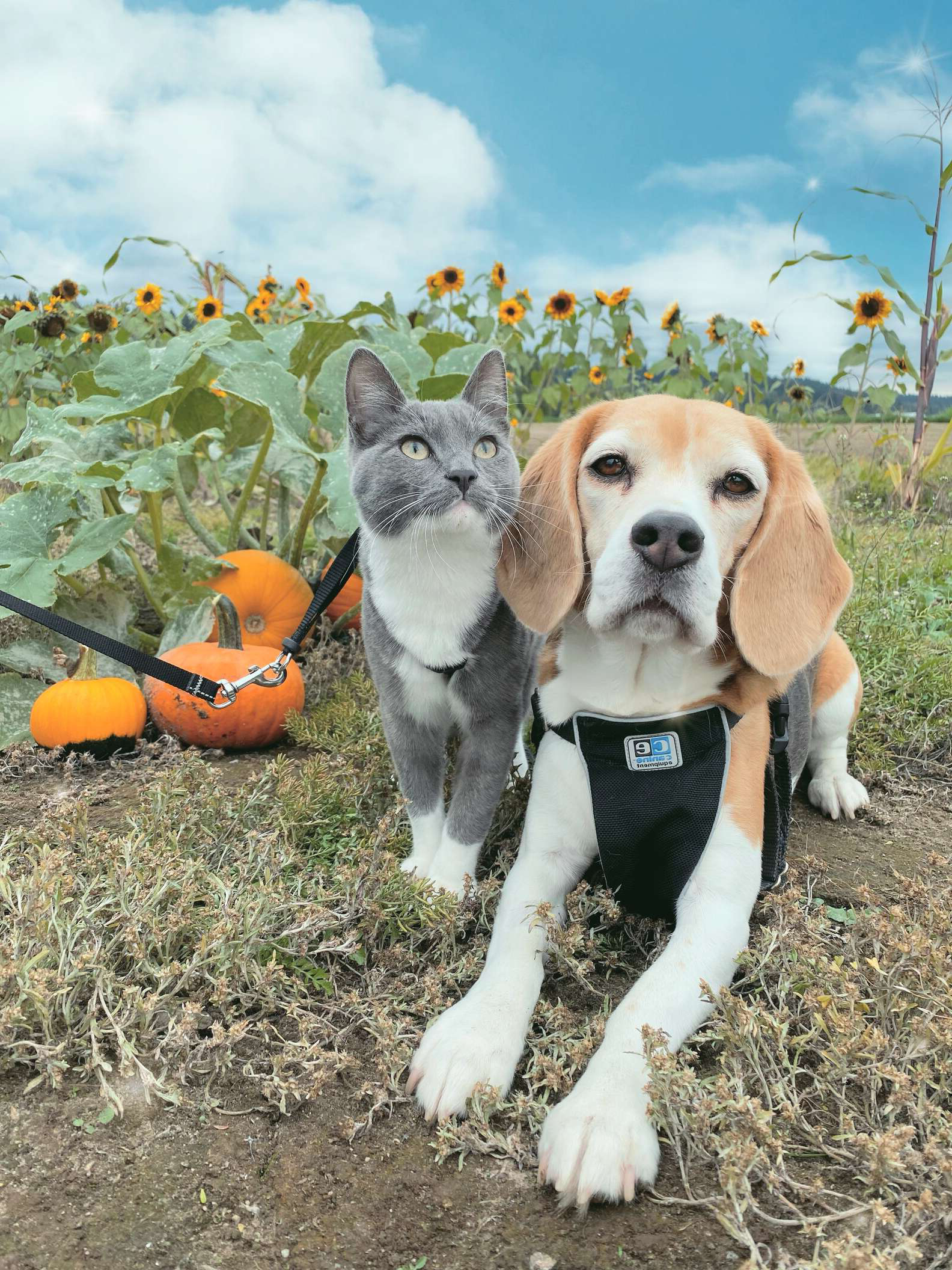 貓狗是好朋友!一起到南瓜園遊玩 兩隻黏緊緊站好:麻~幫我們拍照♡